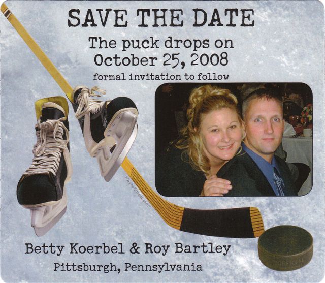 Some of the couples started off with the Penguin theme even before the wedding. Roy and Betty Bartley got engaged when Roy proposed at a game between the Penguins and the Florida Panthers, on January 5, 2008. “The Pens won, 3-0, which made the day even better,” Roy said. As wedding plans began, the first order of business was the Save the Date card, reminding everyone that an invitation would follow.