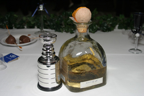 Heather and Doug Derda wanted a full hockey wedding, but it just didn’t happen for various reasons. “But we had Penguin “elements”, Doug said. “On my vest, I had my season ticket pins from the Pens, my wife wore a Penguin garter and available at the head table was top shelf tequila. Guests could do a shot of tequila out of a miniature Stanley Cup.