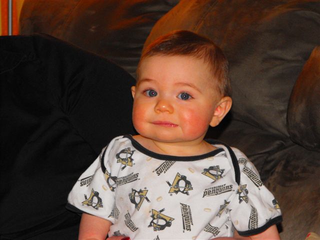 In the meantime, some of you may remember that last year during the playoffs, we reported on a little girl who was born in Pittsburgh named Crosby Elizabeth. She was born on May 2, 2008. Her mom and dad, Jenn and Shawn Morrill, wanted another “C” name because they already had a son named Connor. Shawn was lobbying for Sidney, boy or girl. Jenn wasn’t feeling it for either a boy or a girl, so she jokingly suggested “Crosby”. It stuck, the littlest Pens fan was born during the playoffs, and as you can see, she is now about eight months old and still a big Penguin fan!