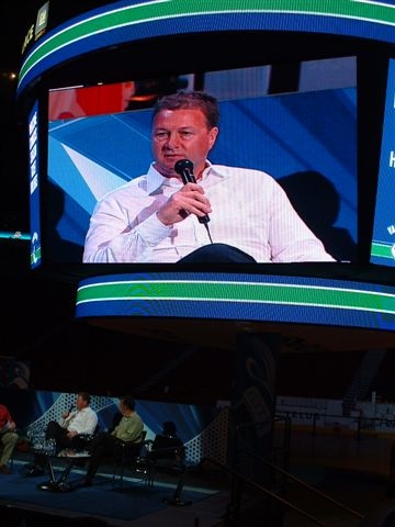 This event was streamed live on the Internet, and according to Canucks CEO Chris Zimmerman, 11, 000 people watched it online. Because of the streaming, the State of the Franchise felt like we were watching the taping of a TV show, rather than the town hall meeting feel of events past. Gone were the roving ticket account managers, handing microphones to season ticket holders to ask questions of the General Manager and staff.