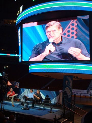 A larger than life Mike Gillis on the massive scoreboard, lowered to just above floor level at the S.O.F meeting